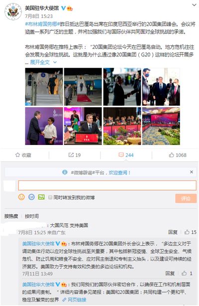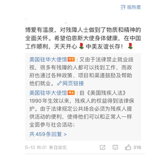 但他还有个身份,美国驻华大使馆微博留言区的大V。