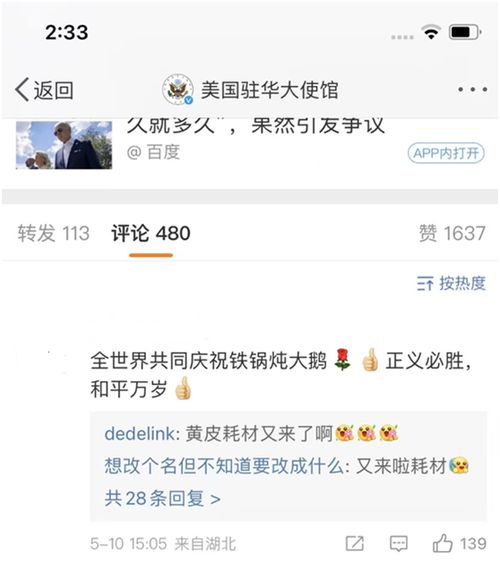 美国驻华使馆大致以“言论自由”原则运营其社交媒体账号,表示“期待批判性的讨论和辩论,这可能包括对美国政策的支持和批评”。