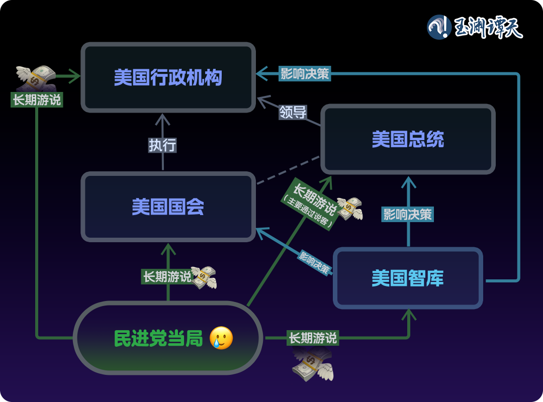 谭主梳理了一张民进党当局渗透美国涉台决策的流程图: