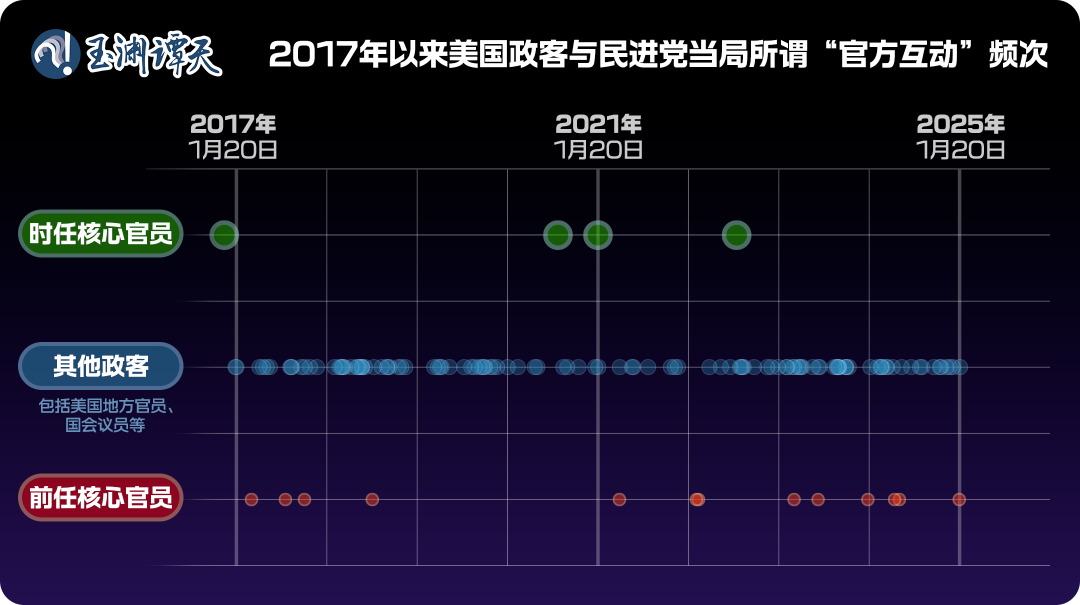 谭主梳理了2017年以来民进党当局与这些政客公开的所谓“官方互动”,包括美国政客窜台、与民进党当局见面、通话等。