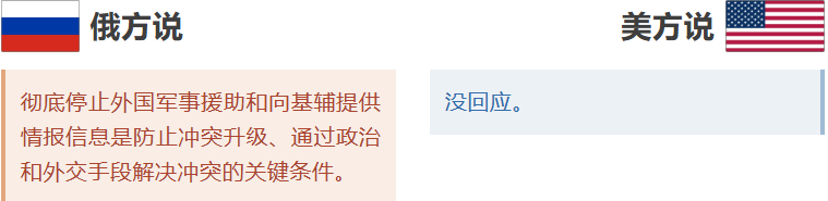 俄方的通稿称,双方强调,彻底停止外国军事援助和向基辅提供情报信息是防止冲突升级、通过政治和外交手段解决冲突的关键条件。但在美方的通稿中,没有看到相关表述。