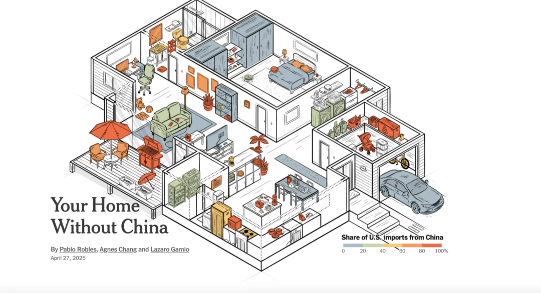前不久《纽约时报》发布了一则数据可视化报道,从厕所到卧室,详细列举出了美国家庭中每一类商品从中国进口的比例,烤面包机、雨伞、闹钟等商品从中国进口的占比都超过了95%。