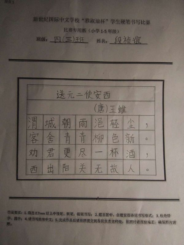书写比赛在一至高二年级进行,面向全体在校中小学生,分为初赛和决赛。各班(年级)语文教师认真组织进行全班(年级)性的初赛,再从中选拔优秀学生参加决赛。同学们兴致高涨,态度积极,都能按照要求书写相应的古诗内容。
