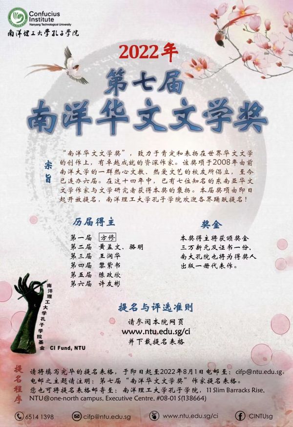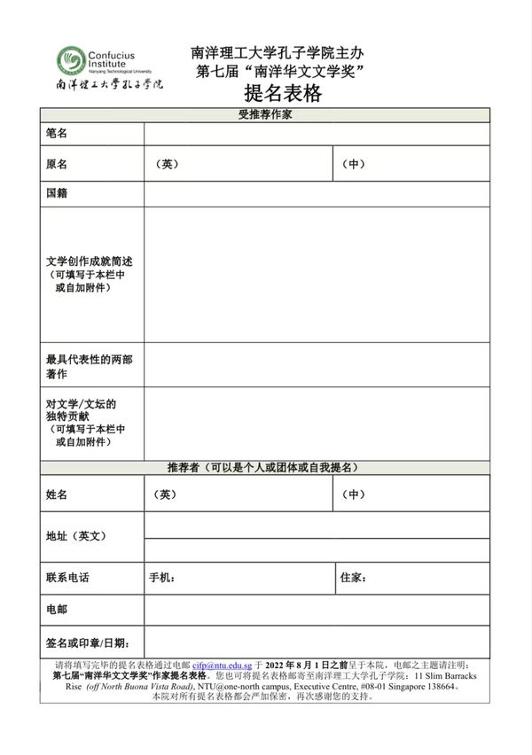 请将填写完毕的提名表格,于即日起至2022年8月1日电邮至:cifp@ntu.edu.sg 。电邮之主题请注明:第七届“南洋华文文学奖”作家提名表格。