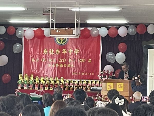 整个仪式在上午8时开始,首先请来宾们和全体师生肃立,唱“东华中学校歌”。接着由学校董事长黄永忠先生致辞。董事长对获得成绩优秀奖的学生们及毕业生们的刻苦学习,特别是在新冠疫情严重期间,坚持在网上上课,胜利地完成了有关课程的学习,给予了高度的赞扬。董事长鼓励高小毕业生及初中毕业生们能继续学习,学校的大门永远为大家开放着。而对于即将投入社会工作的同学们,也预祝他们事业成功,能够及早实现自己的人生理想。