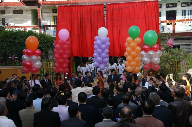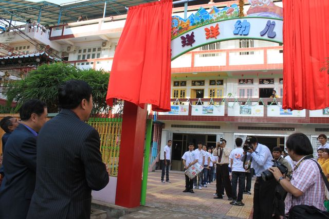 接下来继续为纪念碑文、会议室、图书阅览室、民族服装室、长城汉语多媒体课室等剪彩揭牌。孔子课堂大厦坐落在曼德勒市中心,是幼儿园、办公室、网络室、图书阅览室、多媒体会议室、练功房等集为一体的五层楼大建筑。之前,郁总及各位领导,还为孔子课堂新开的“喜洋洋幼儿园”进行剪彩揭牌。