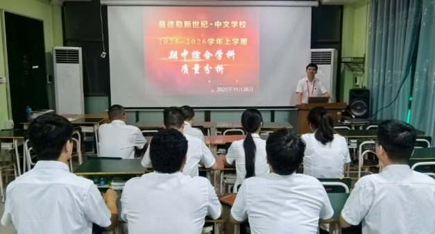 2025年11月20-26日,缅甸新世纪(CPEC)国际中文学校曼德勒校区召开了期中质量检测分析会,会议以本次期中质量检测的成绩数据为导向,围绕语文、数学及综合学科进行系统分析,旨在全面提升学生汉语水平与整体学科素质。会议分别由教学副主任李雪婷(语文)、教学副主任徐华斌(数学)及教学主任杨旭冬(综合学科)主持,常务副校长王粮钧、副校长罗仕荣及全体科任教师参会。
