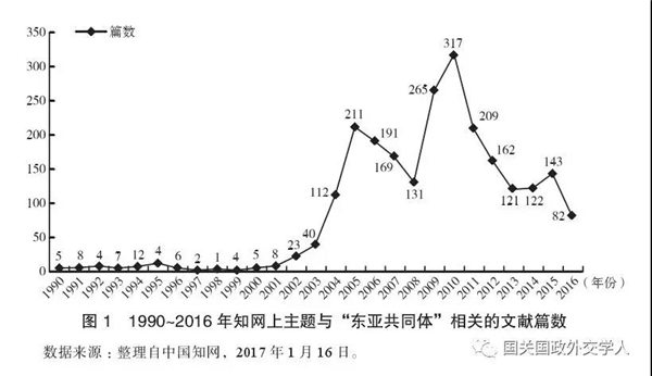 当下,东亚是全球经济增长速度最快、发展潜力最大的地区之一,区域与次区域合作正式提上议程。至2016年,东亚共同体机制的启动已逾十年,虽取得了一定的成果,但总体进展缓慢。相关研究热度也明显下降,研究成果减少。以中国知网为例,笔者以“东亚共同体”为主题进行搜索,从2010年起,“东亚共同体”的研究成果呈逐年递减的态势,从峰值2010年的317篇,锐减至2016年的82篇(见图1)。