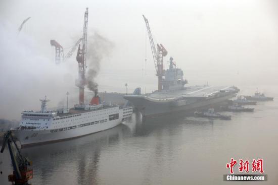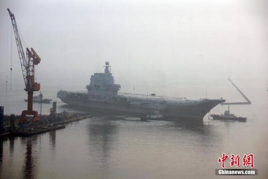 资料图:中国首艘国产航母从大连造船厂码头启航,赴相关海域执行海上试验任务,主要检测验证动力系统等设备的可靠性和稳定性。 中新社记者 杨毅 摄