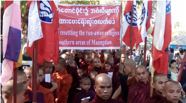 国际社会闹,国内也不消停。11月18日,有500多人在若开实兑市街头举着佛教旗帜、标语等游行示威,抗议给3000余名穆斯林以卡曼族(小编补充:卡曼族是唯一一个在若开邦受认可的穆斯林族群)的公民身份。走在游行最前列的是佛教僧侣们。这样的游行示威已经出现多次,但政府相关部门没有任何回应。