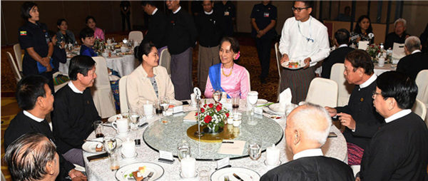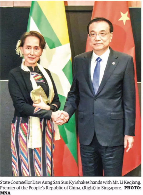 11月15日,在新加坡参加第33届东盟峰会及相关峰会的国务资政昂山素季于新达城会议中心与中国总理李克强举行双边会谈。会见期间,昂山素季和李克强就促进双边关系与合作交换了意见,包括教育和人力资源开发,若开邦流离失所者遣返的筹备工作和和平进程。李克强表示,中国支持缅甸政府的和平与民族和解努力和解决若开邦局势的努力,并将继续支持缅甸在国际舞台上的发展。昂山素季对中国政府对和平进程和若开邦问题给予缅甸政府的一贯支持表示赞赏。