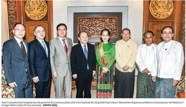 11月26日下午4点,国务资政部昂山素季在内比都外交部总部接见由中国国家发展和改革委员会副主席宁吉喆先生率领的代表团。在会议期间,他们根据“共同建设谅解备忘录”讨论了实施早期项目未来工作计划的事项,以实现两国于2018年9月9日在北京签署的缅中经济走廊。国务资政强调,这些项目的实施需要符合计划和优先事项缅甸可持续发展计划(MSDP),并支持两国人民的长远利益。她还强调有必要根据国内规则和条例系统和准确地进行磋商。出席会议的还有商务部部长丹敏、计财部部长吴梭温,国际合作部部长吴觉丁,中国驻缅甸大使洪亮等。