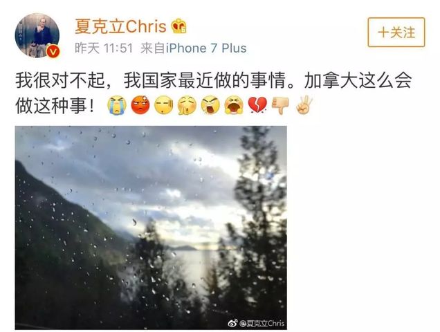 加拿大真无辜吗?14日上午,“在台湾发展的加拿大籍节目主持人、演员夏克立”发出一条中文微博:我很对不起,我国家最近做的事情。加拿大这(怎)么会做这种事!文字后面还有“流泪”“心碎”“尴尬”等多个表情。到昨天下午7时,该微博被点赞已经超过5.7万次。在4000多条评论中,获得点赞最多的粉丝评论是:“跟你没有关系啊,你是个很善良的人哦。”