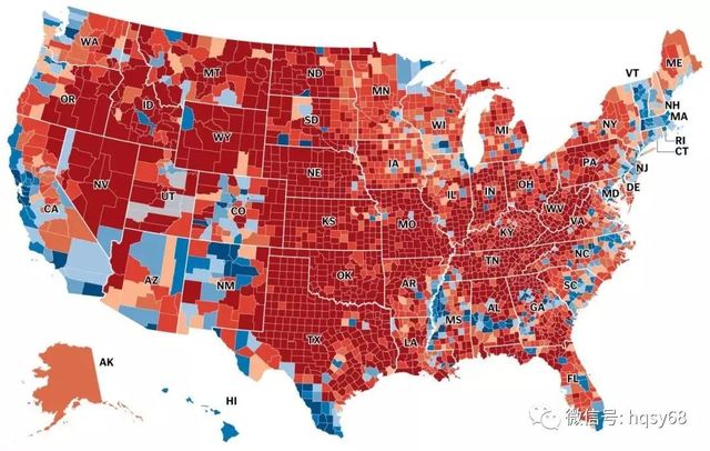 ▲2016美国大选区域图 蓝色区支持希拉里 红色区支持特朗普