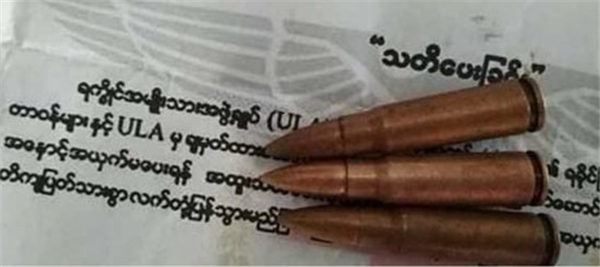 12月21日,“出格”的事来了,AA军开始寄出了一封又一封装有子弹和该军队盖章的恐吓信。恐吓信中表示,不要打扰“实施拉启塔(Rakhita)方式的那些人”(*后经本社大神07解释,这个词的意思是“若开守护者”,译为Rakkhita更加合适)。AA一直以来以“拉启塔”自居,意思是实现独立自主的若开,但这里的“独立”明显有歧义,比如2018年妙乌事件中,前若开民族党(ANP)就高举“光复若开古国”的旗号,并公开声援AA军。