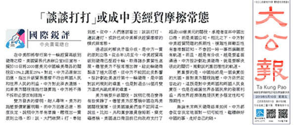 央视网消息:中央广播电视总台“国际锐评”5月9日、10日、11日连续刊播题为《谈谈打打,或许成中美经贸摩擦的常态》《企图利用台湾问题牵制中国的冒险必将是条死路》《关税大棒损人害己》《解决中美经贸摩擦 关键在照顾彼此关切》等4篇有关中美经贸摩擦评论文章。众多境外媒体和网站陆续转发。