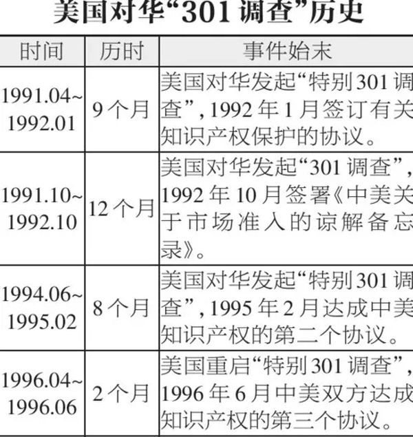 从1991年开始到1995年,中国人从国内媒体上听到最多的恐怕就是“301调查”。看看下面这张图表就知道,那几年我们遭遇了美国人多少次“301调查”。
