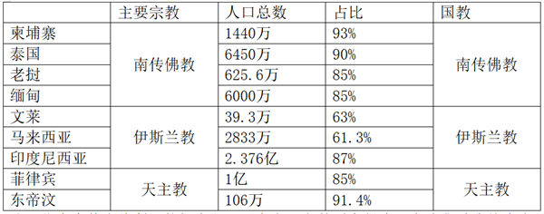 东南亚几乎每个国家都是多元宗教国家。按照信仰划分,东南亚国家大体可以分为以下几种类型:以南传佛教为主要信仰的柬埔寨、老挝、泰国、缅甸;以伊斯兰教为主要信仰的印度尼西亚、马来西亚和文莱;以天主教为主要信仰的东帝汶和菲律宾以及信仰结构比较均衡的越南和新加坡。[陈国典:《世界宗教大观》,台北:秀威出版社,2010年,第64-66页。]东南亚各国信仰情况如下表: