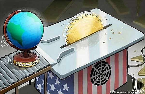 ▲【电锯惊魂】传送带正在把代表全球化的地球仪送向美国电锯。(英国《一周》杂志网站)