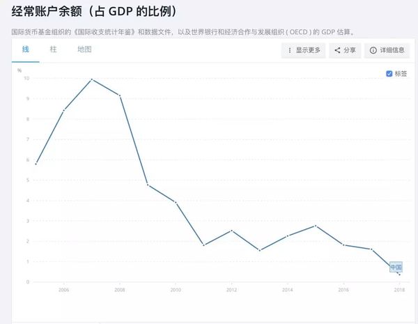 根据世界银行数据,2007年中国经常账户盈余占比为9.948%,但是2017年已经下降至1.607%,2018年进一步下降至0.361%。