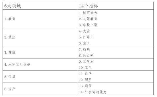 缅甸的多维劣势指数采用非货币方面的衡量指标,有6个大的领域(教育、就业、健康、水和卫生设施、住房、资产),这6个大的领域又细分为14个指标。具体如下表: