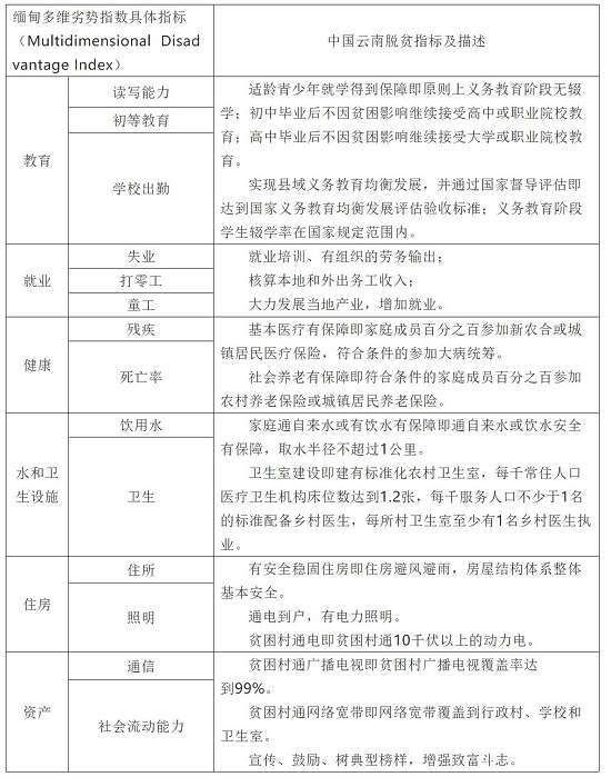 中国云南的“两不愁,四保障”,基本上能对应缅甸的多维劣势指数的6大领域。将缅甸多维劣势指数中的14个指标,与中国云南有关脱贫指标大致进行对比,如下表: