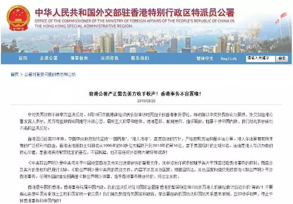 香港是中国的香港。香港事务纯属中国内政。我们坚决反对任何国家企图拿香港的繁荣稳定和700多万港人的福祉做讨价还价的“筹码”!不要痴心妄想中国会拿领土主权和国家统一做交易!我们强烈敦促有关国家和政客,学点最起码的国际法和国际关系基本准则,立即收手收声,停止干预香港事务和中国内政!(外交部驻港公署)