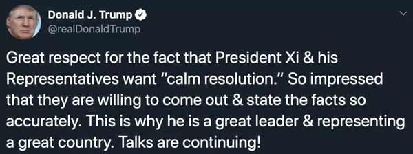 特朗普当天在推特上为此话点赞,称对提出“冷静解决方案”的中方领导人和贸易负责人表示崇高敬意,认为中国在阐述解决经贸问题上表达精准,让他“印象深刻”。26日,特朗普在G7峰会期间回答记者提问,有提到了刘鹤副总理的演讲:“他用到了‘冷静’一词,我表示同意。”