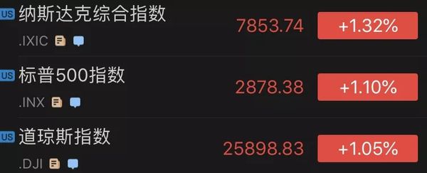 在特朗普连发托市言论后,美国市场方面感到了气氛的缓和。周一道琼斯工业指数收盘收涨1.05%,报25898.83点;标普500指数涨1.10%,报2878.38点;纳斯达克综合指数涨1.32%,报7853.74点。