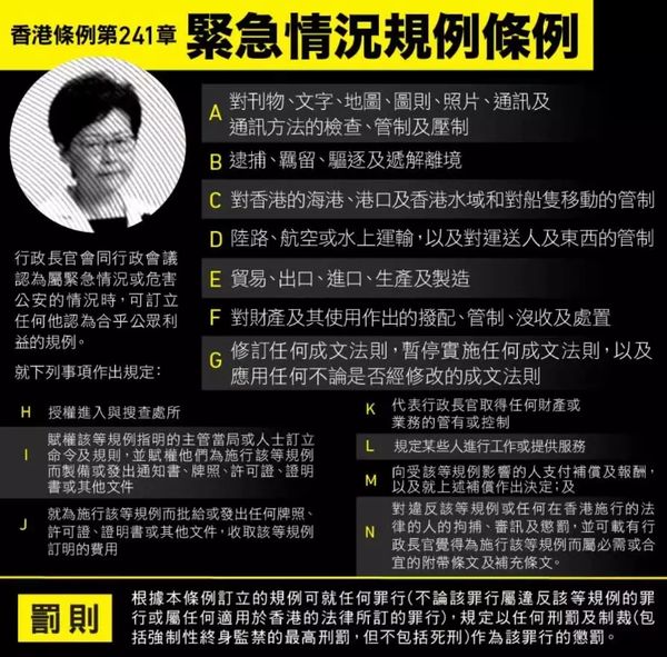 “紧急法”即香港现行法例中的《紧急情况规例条例》。条例列明,行政长官会同行政会议在认为属紧急情况或危害公共安全的情况时,可订立“任何合乎公众利益的规例”,而不需通过立法会,如可实施戒严、禁示威者蒙面等,也可拘捕乱港人士,对标语甚至不良媒体做审查。
