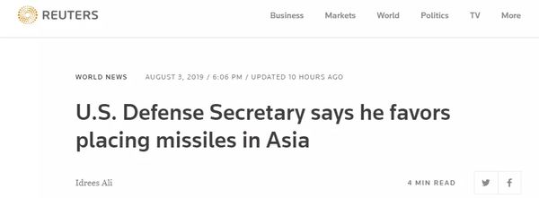 路透社关于埃斯珀在亚洲部署导弹的报道截图