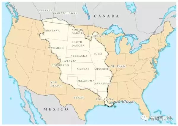 1803年美国买下的路易斯安那(中间淡黄色部分)