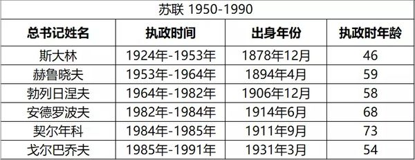 大家看看,从60年代开始到1985年,苏联最高领导人都是00后与10后,85年接班的戈尔巴乔夫是30后,中间20后没有了!