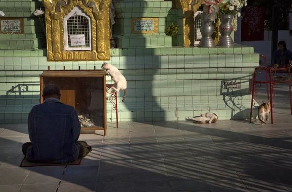 2017年1月,仰光崭新的商办大楼"Myanmar Plaza"里举行过一场"安居"祈福仪式。活动舞台背板隐隐浮现三座砖红色的缅式佛教尖塔,安坐在九张木制主人椅、台上一字排开的"主角",不是公司领袖或政府官员,而是在缅甸本地颇受尊崇的佛教高僧。他们身披暗红色与土黄色的上座部佛教袈裟,手持绘有缅甸文字与图腾的深棕色天鹅绒圆扇,每人跟前摆放一份活动主办方所献上的"僧侣用品"。