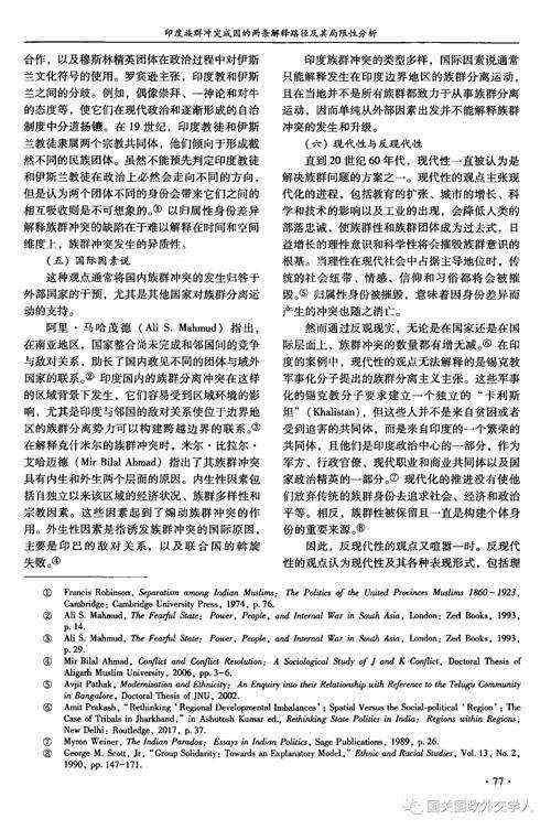在解释印度族群冲突成因方面,既有的解释可被归类为两条路径,即政治解释路径与非政治解释路径。在政治解释路径中,既有解释主要包括精英动员论、身份建构论、政治制度和国家政策论;非政治解释路径主要从公民社会交往程度、全球化与经济竞争、人口迁移、身份差异、国际因素、现代性与反现代性出发分析印度族群冲突。印度族群冲突成因复杂,两条既定解释路径的不足是:强调单一解释因素;没有说明因果机制;缺少一个宏观的解释框架以说明各种类型的族群冲突成因;没有提出一个印度政府应对冲突的治理模式。