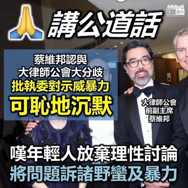 不久前,大律师公会副主席蔡维邦辞去在公会的所有职务。辞职的原因,与“大律师公会近年来被背后的圈子操控,破坏法律原则,屡屡把矛头指向依法履职的警察、而无视极端激进分子的影响”有关。