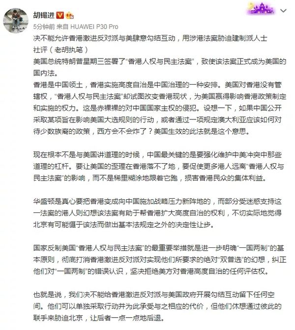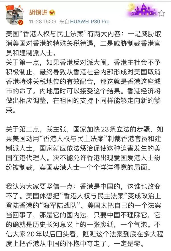 刚刚,环球时报总编辑胡锡进更新微博,对美国“香港人权与民主法案”两大内容进行分析和批驳,他表示“大家要坚信一点:香港是中国的,这谁也改变不了”。