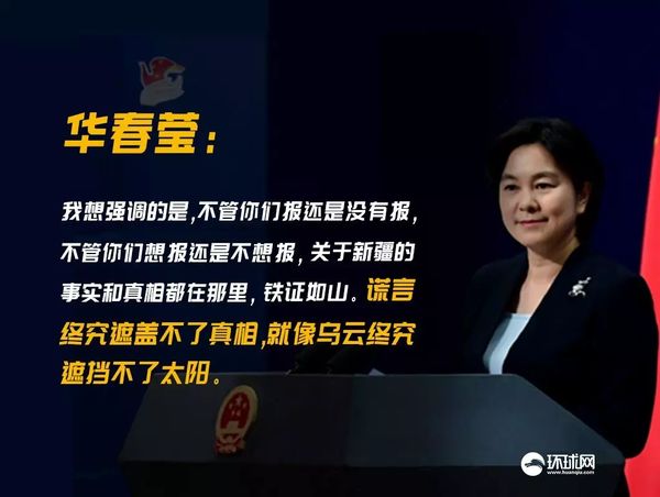 华春莹说,面对这样的事实,西方主流媒体和美国、欧洲一些对中国治疆政策横加指责的人,难道真的可以无动于衷吗?他们的良心没有受到任何谴责吗?我想强调的是,不管你们报还是没有报,不管你们想报还是不想报,关于新疆的事实和真相都在那里,铁证如山。谎言终究遮盖不了真相,就像乌云终究遮挡不了太阳。我想作为媒体,你们有这样的社会责任,客观公正地为读者观众呈现最基本的事实和真相,而不是先入为主地选择性失聪失明,误导受众。