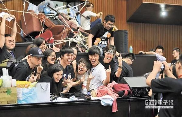 参与占领“行政院”行动的学生在议场内兴奋地合影,图片来自台湾《中时电子报》