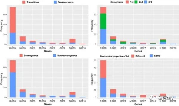 图3. 120个变异位点在8个编码区的分布情况。统计类型包括替换或替代(左上角),密码子位置1-3(右上角),同义突变或非同义突变(左下角),和氨基酸性质(右下角)。