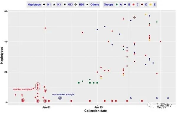 研究发现,从基因单倍型演化关系来看,与华南海鲜市场有关联的患者样本为单倍型H1及其衍生类型,而另有武汉患者样本为单倍型H3,双方应互无交叉,而是来自同一个传染源头。