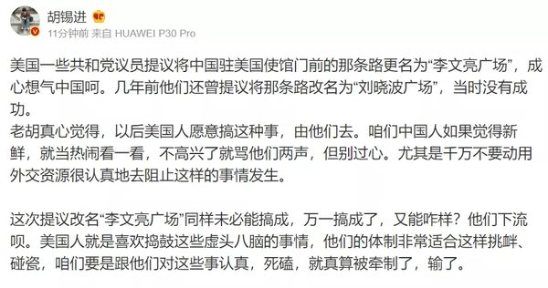 文章导读 胡锡进:美议员想用“李文亮广场”气中国,中国人跟他们认真就输了