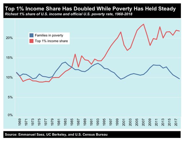 ▎美国收入最高的1%的人群收入占比翻了一番,而贫困人口收入比例保持稳定。最富有的1%的美国人收入占比和美国官方贫困率,1968-2018年