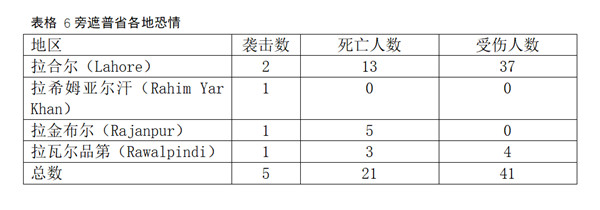 旁遮普省2019年发生了5次恐袭,比2018年多1次。其中,2次袭击发生在拉合尔,1次发生在Rawalpindi,2次发生南旁遮普的Rahim Yar Khan和Rajanpur地区。一共21人在这些袭击中丧生,另有41人受伤。巴基斯坦塔利班分支“卫士”(Hizbul Ahrar)策动了3次在拉合尔和拉瓦尔品第的袭击,共造成8名警察和7名平民丧生。俾路支地区的反叛组织BLA和BRA策动了在南旁遮普地区的2次袭击,共造成5人死亡。在袭击目标上,5次袭击中有3次是针对安全部队和执法人员的,另有1次袭击是针对当地的油气管道,1次针对平民。
