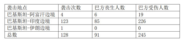 2019年,巴基斯坦共遭受到来自邻国的128次跨境袭击,较之于前一年下降2个百分点。其中来自阿富汗方向有4次,印度方向有123次,伊朗方向有1次。这些袭击共造成了91人死亡,245人受伤,伤亡人数较2018年下降了18个百分点。在袭击中丧生的91个巴基斯坦公民有61人是平民,29人是边防军人,1人是特种部队成员。