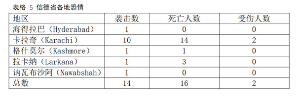 信德省2019年共发生恐袭14次,较之于前一年多2次,其中10次恐袭集中发生在卡拉奇,另外4次发生在信德其它地区。这些袭击共造成18人死亡,2人受伤。在14次袭击中,6次是教派矛盾引起的,这些袭击均在卡拉奇发生,主要受害者是当地什叶派和逊尼派信徒。同时,还有一些当地的极端宗教主义势力策动了4次恐怖主义袭击,造成8人死亡,2人受伤。另外,信德地区的极端分离主义势力同样发动了4次,造成4人死亡。