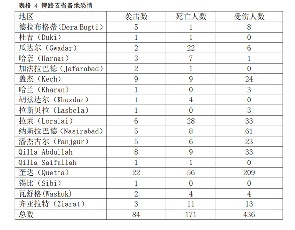 在地区分布上,恐怖袭击发生在全省20个地区。其中,22次发生在首府奎达,9此发生在盖杰(Kech),8次发生在Qilla Abdullah,6次发生在拉莱(Loralai),2次发生在瓜达尔(Gwadar),3次在齐亚拉特(Ziarat)。