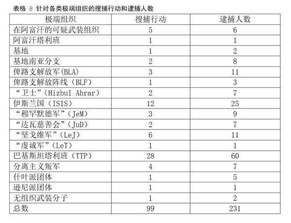 2019年,巴基斯坦反恐维稳部门在99次搜捕行动中共逮捕了231名恐怖分子嫌疑人,其中,巴基斯坦塔利班(TPP)被捕人数最多,人数达到60人。针对各类极端组织的搜捕行动和逮捕人数可见下表。