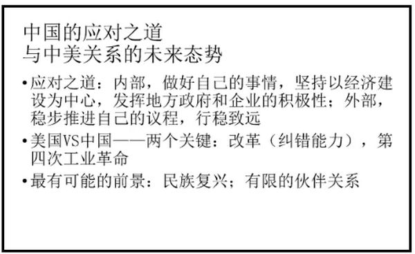 中国怎么应对?很简单,把自己家里的事做好,尤其要把经济搞好。搞好经济要发挥两个主力集团军的作用,中国经济过去四十年总体不错,有两个集团贡献最大,一个是企业家,一个是地方干部。现在这两个集团应该讲都有点信心不足,士气不足,还要想办法发挥他们的积极性,恢复他们的信心。这两大主力集团军信心要恢复了,中国经济的问题不是很大的。