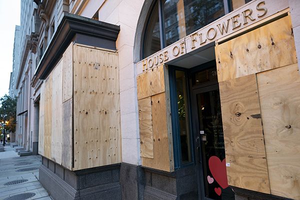 2020年10月31日,美国首都华盛顿白宫附近的建筑工地暂停施工,一些地标建筑、银行、咖啡店、旅馆等纷纷用木板加固门窗,以应对大选期间可能出现的抗议或骚乱。图|新华社